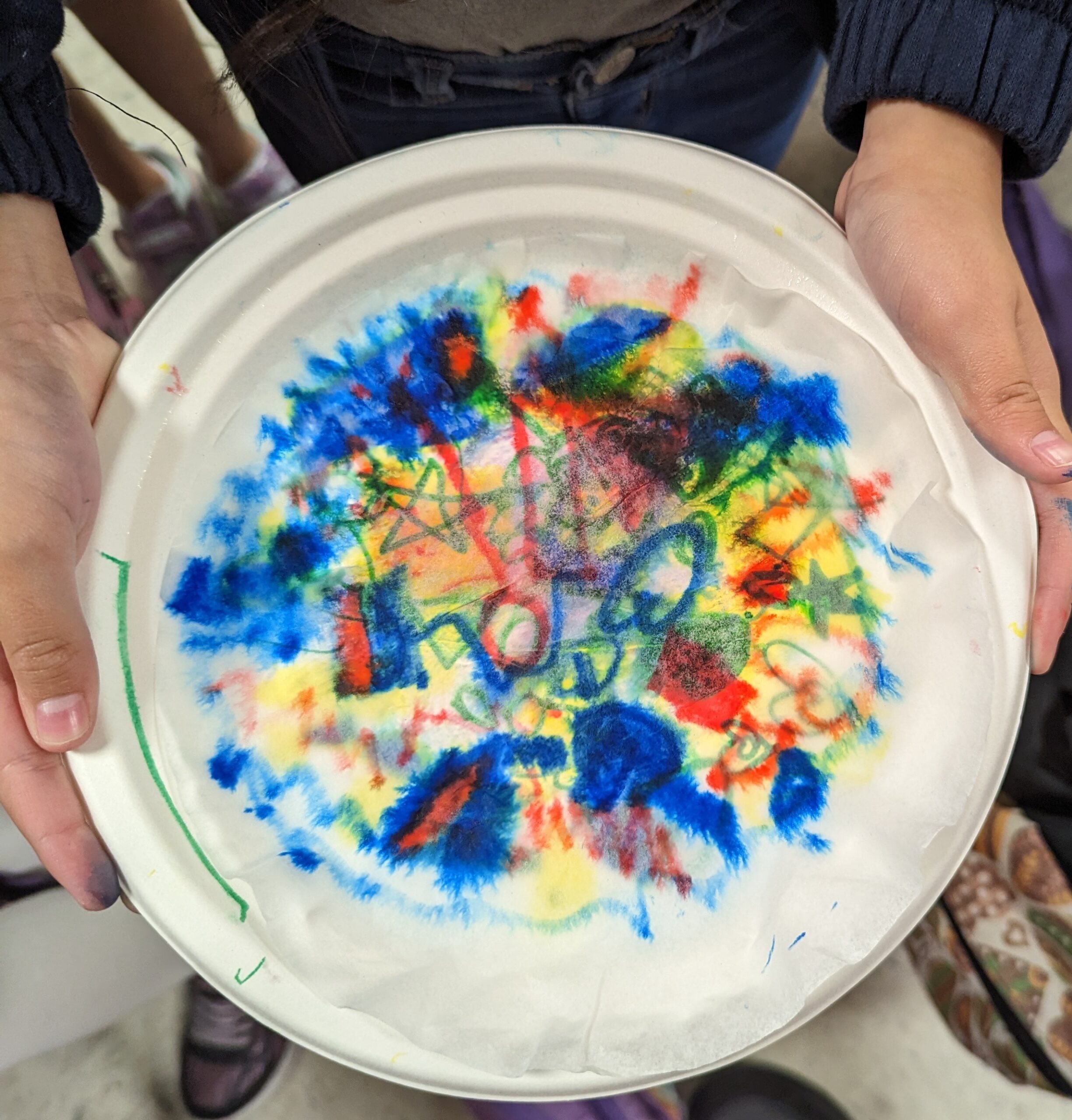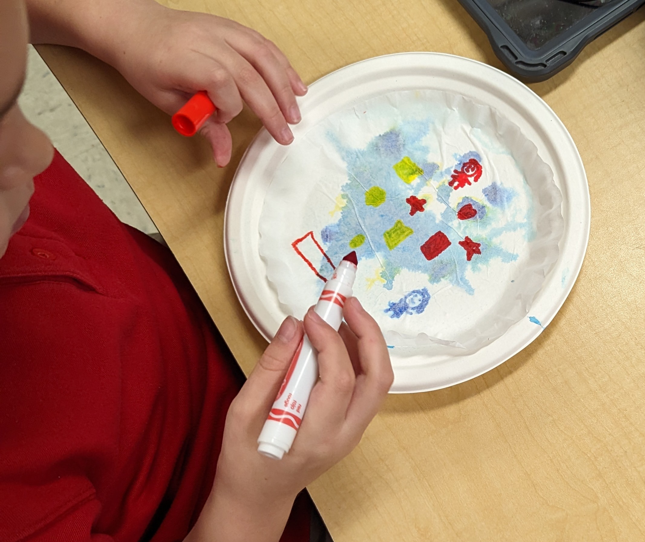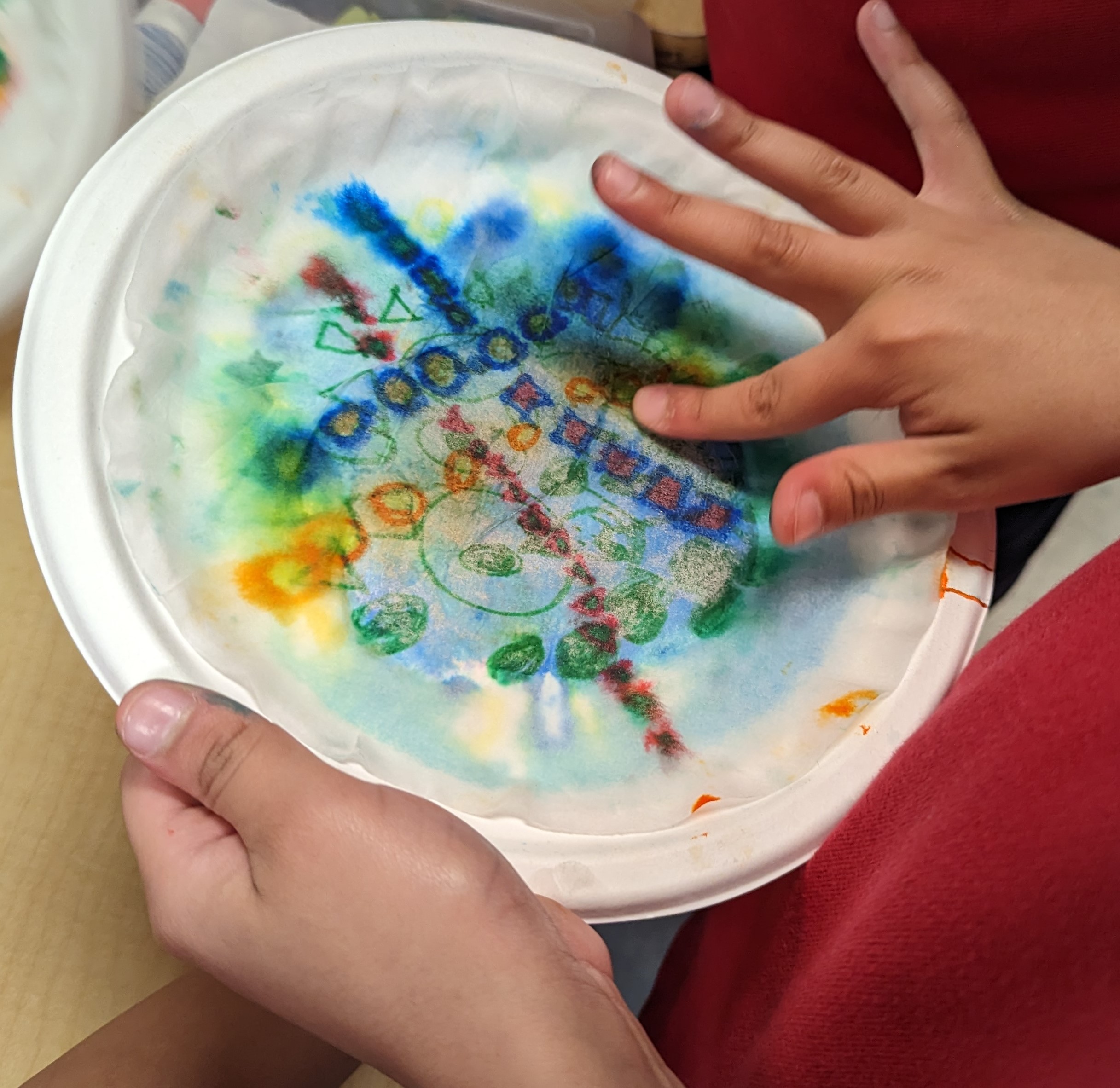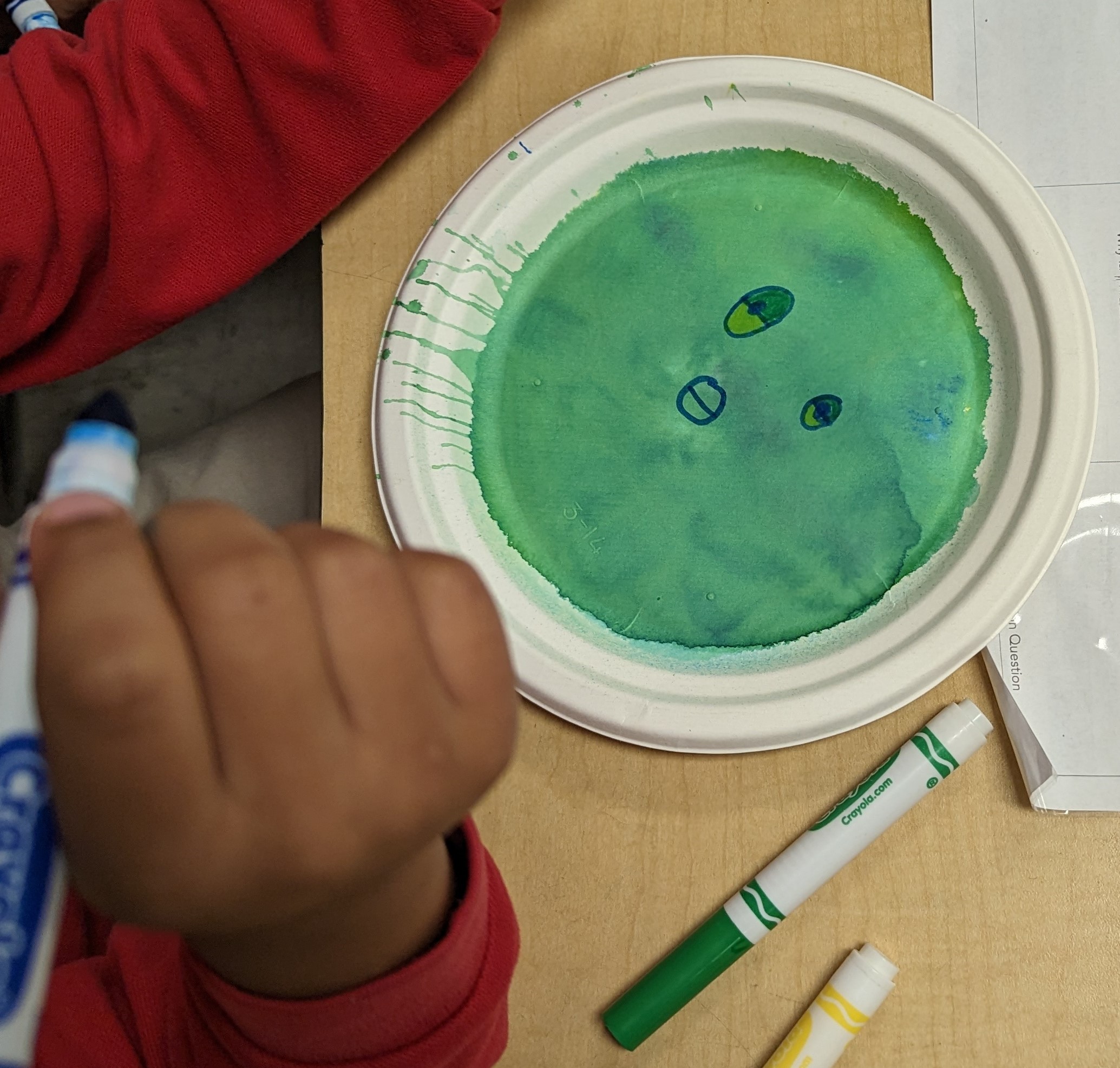 Students began by laying down a primary color on a paper plate using a Crayola Marker, drawing shapes and patterns of their choosing. This was followed by the application of a second Primary color to create their chosen Secondary color.