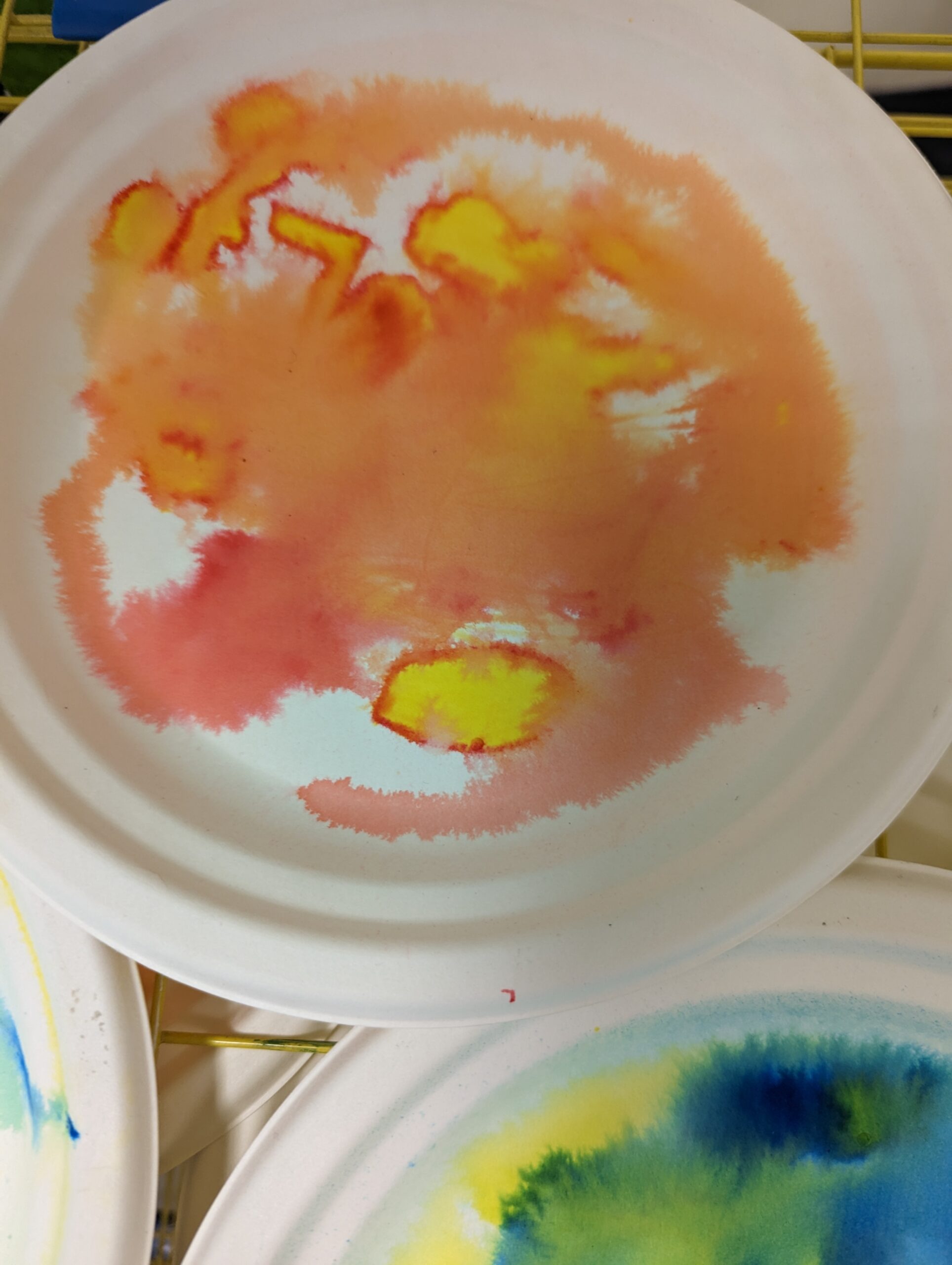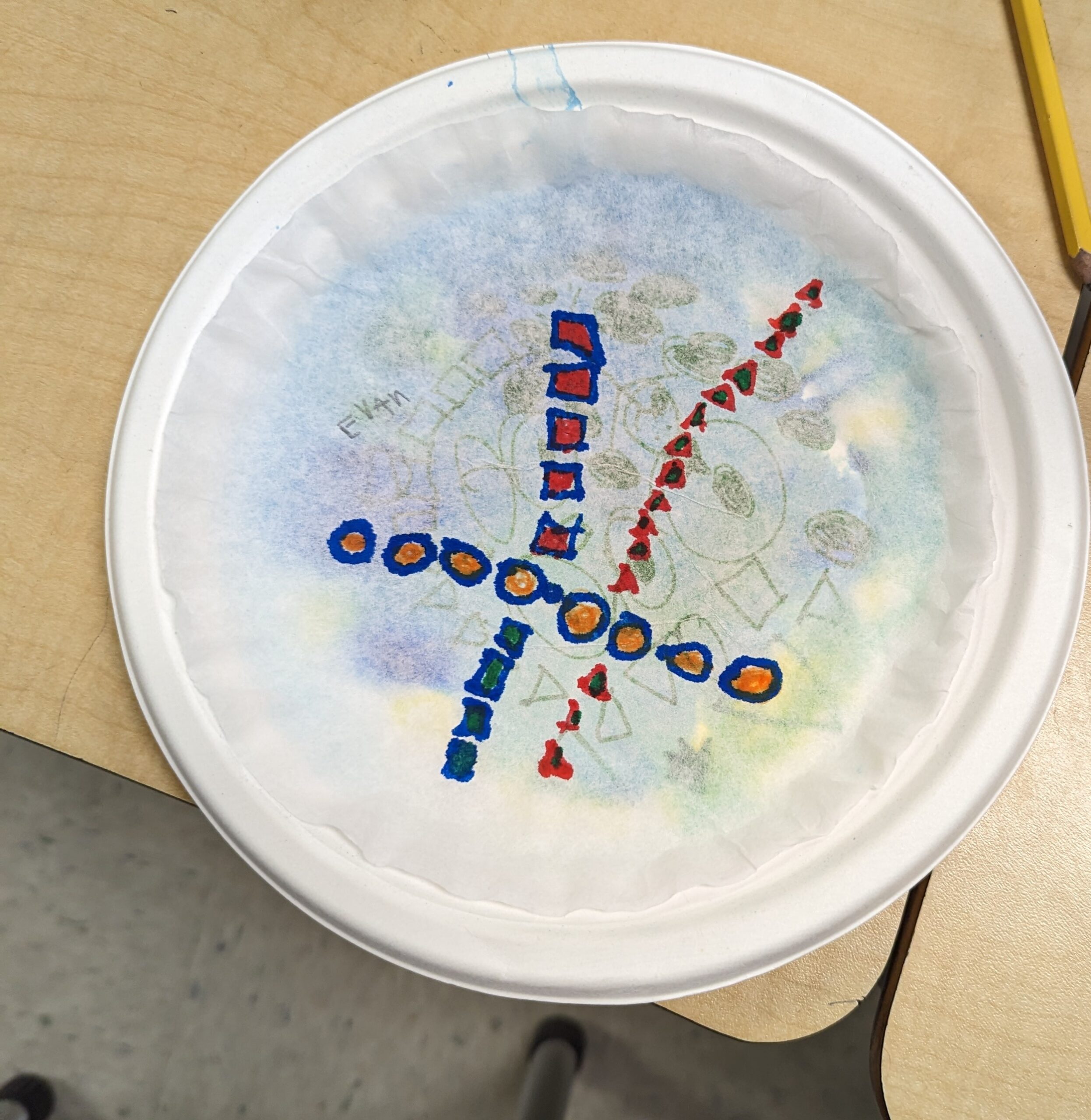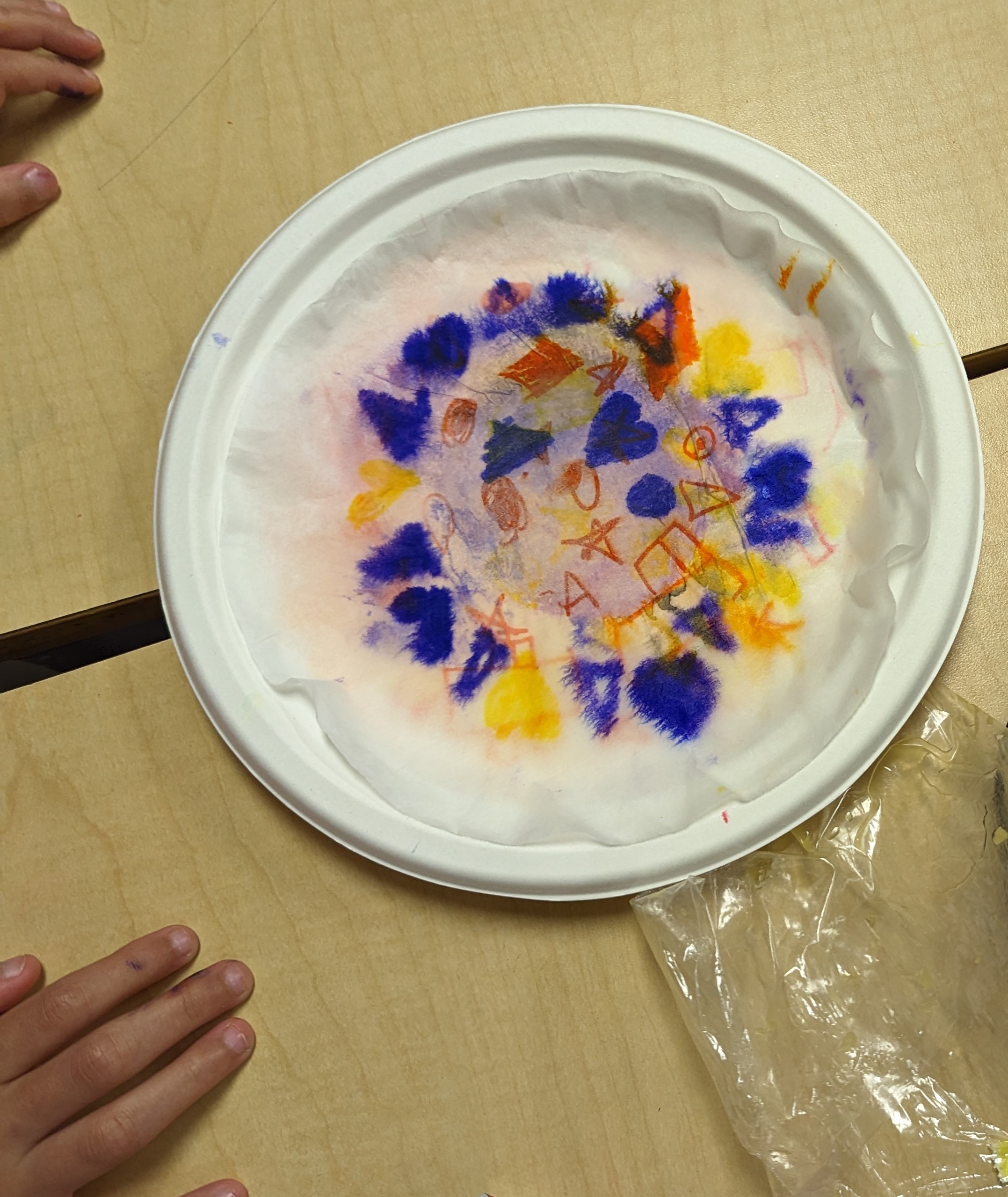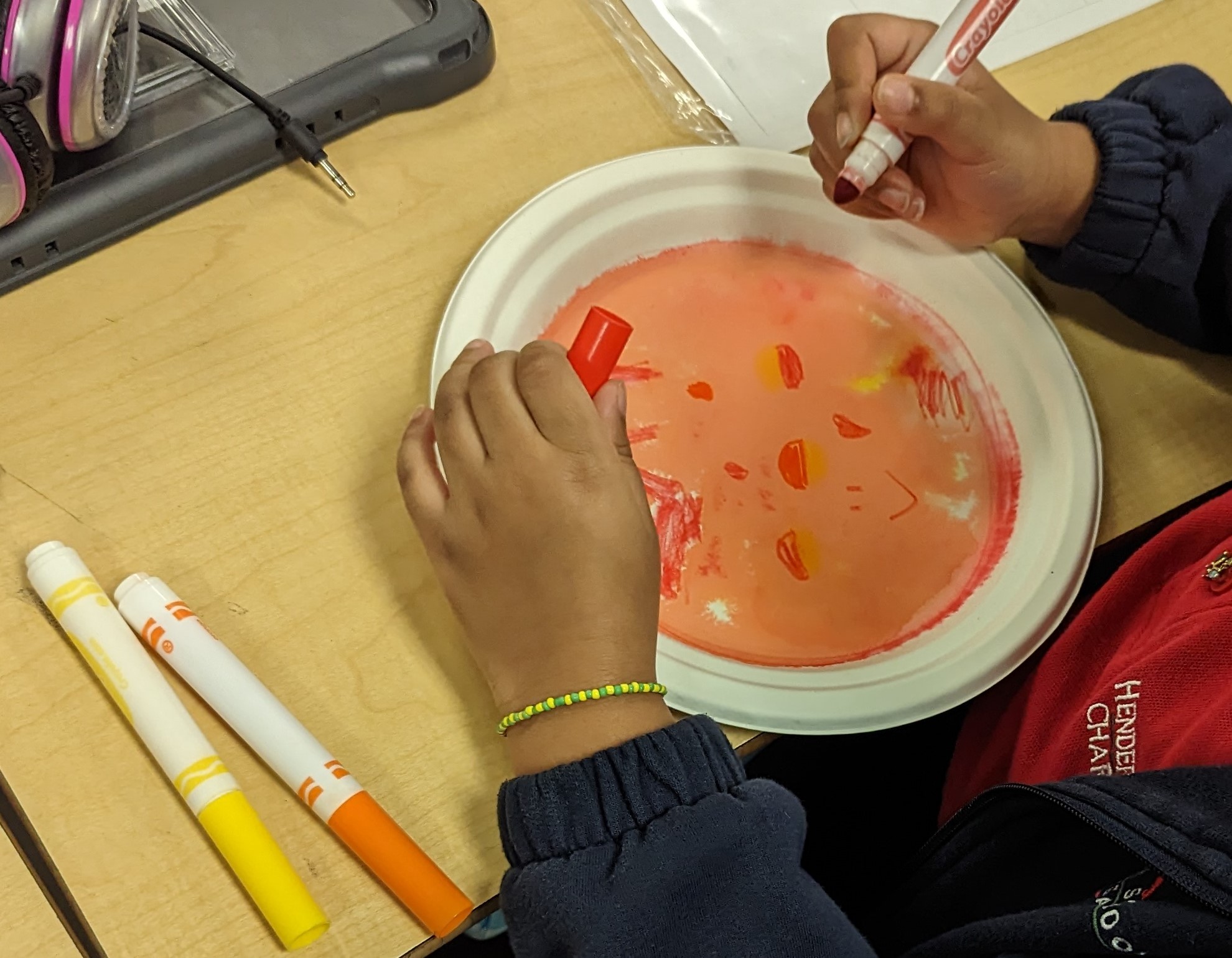Students began by laying down a primary color on a paper plate using a Crayola Marker, drawing shapes and patterns of their choosing. This was followed by the application of a second Primary color to create their chosen Secondary color.