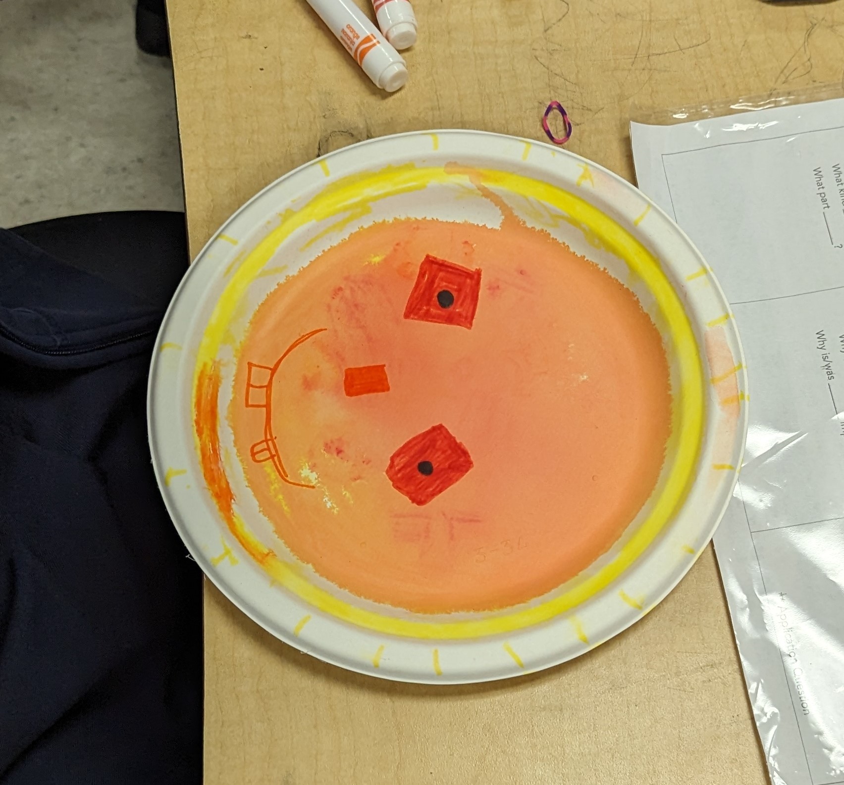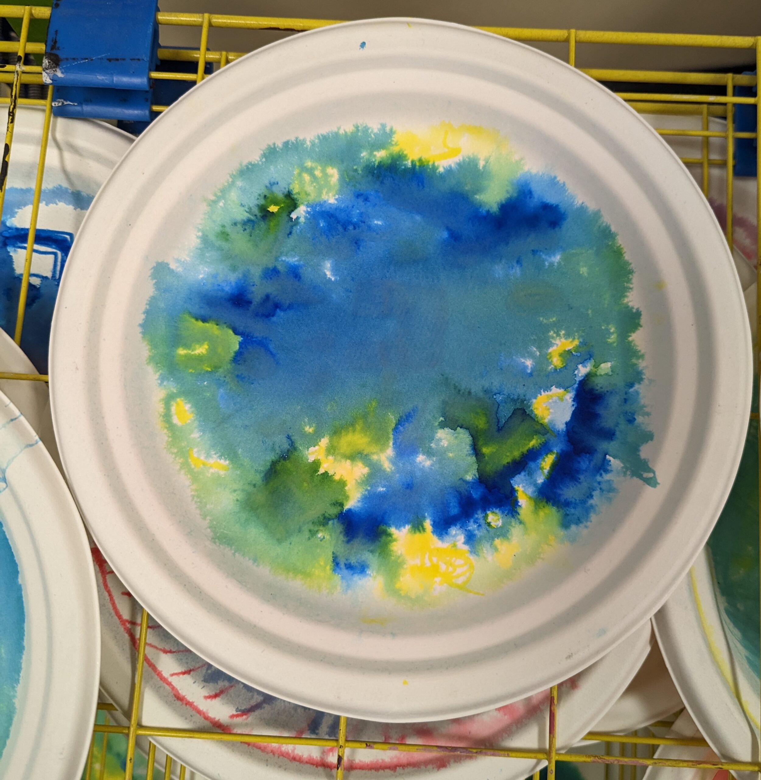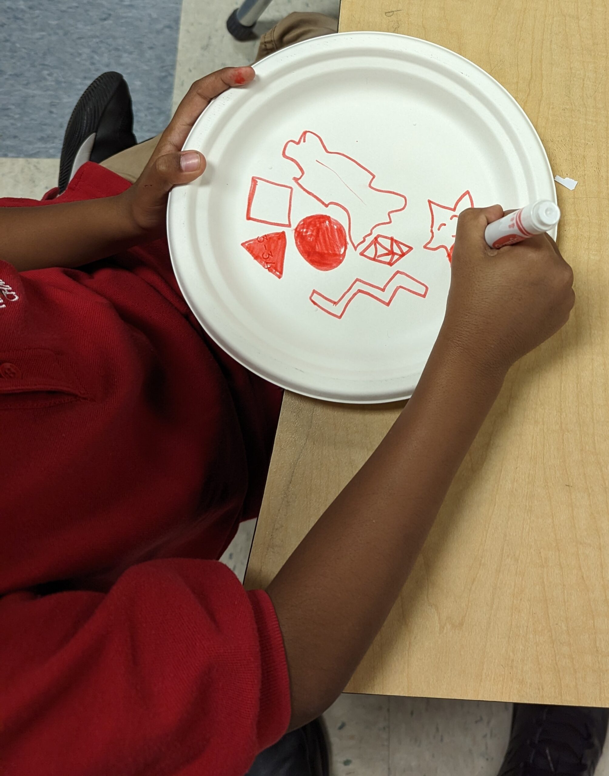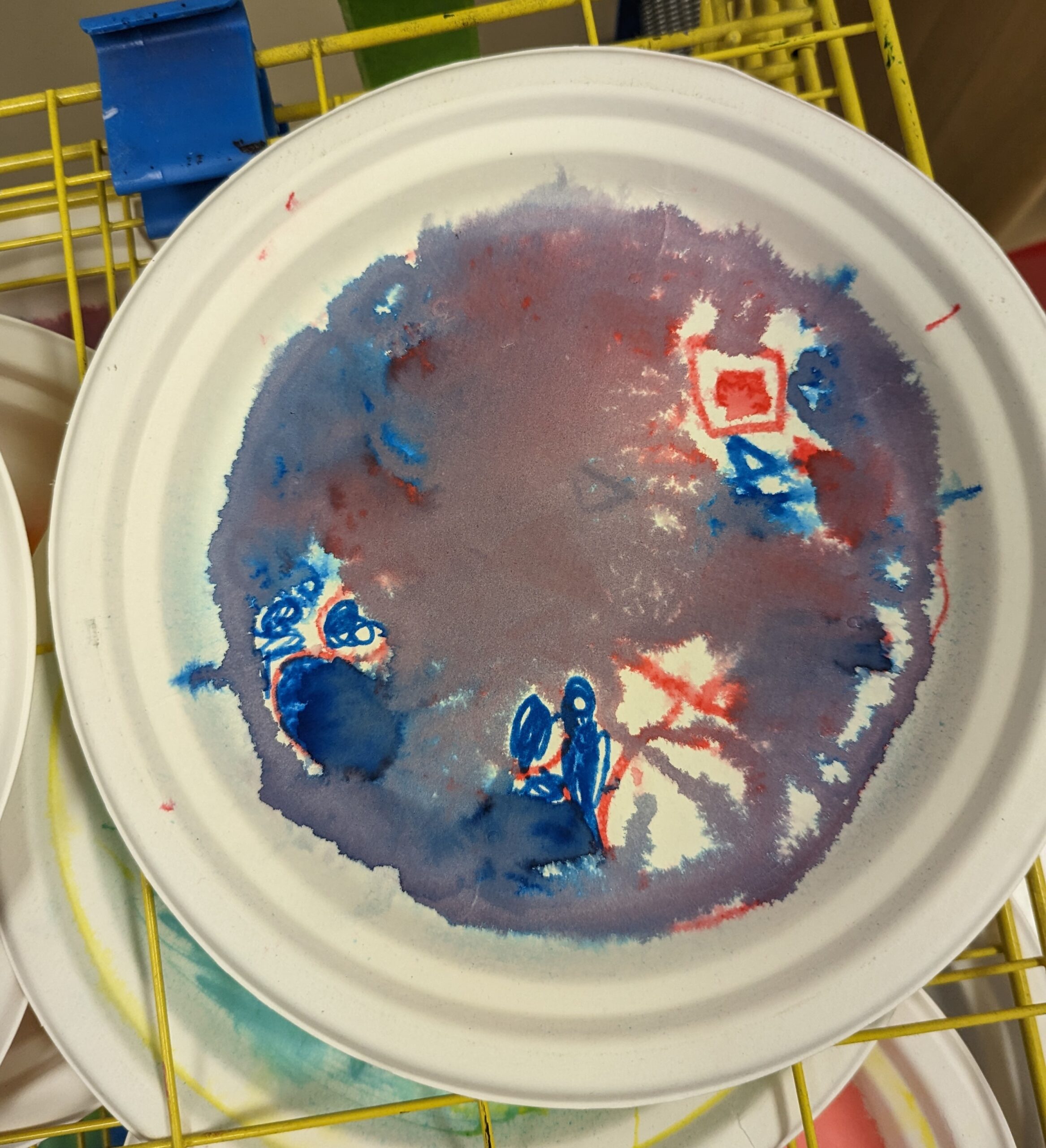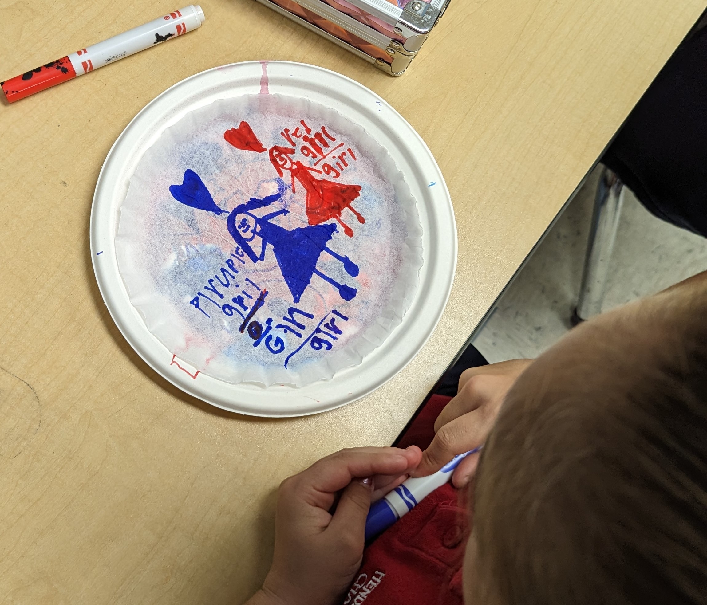 Students began by laying down a primary color on a paper plate using a Crayola Marker, drawing shapes and patterns of their choosing. This was followed by the application of a second Primary color to create their chosen Secondary color.