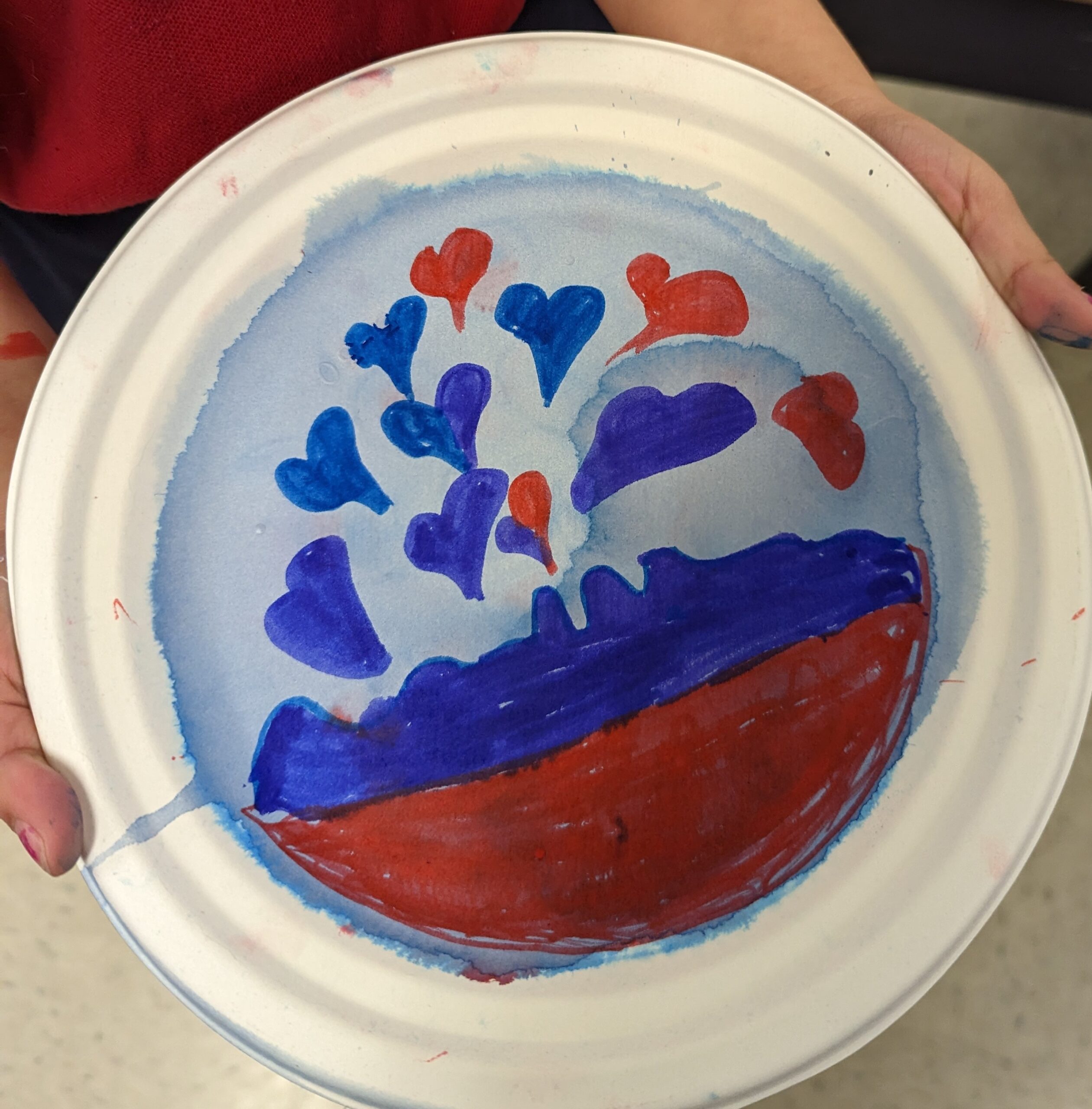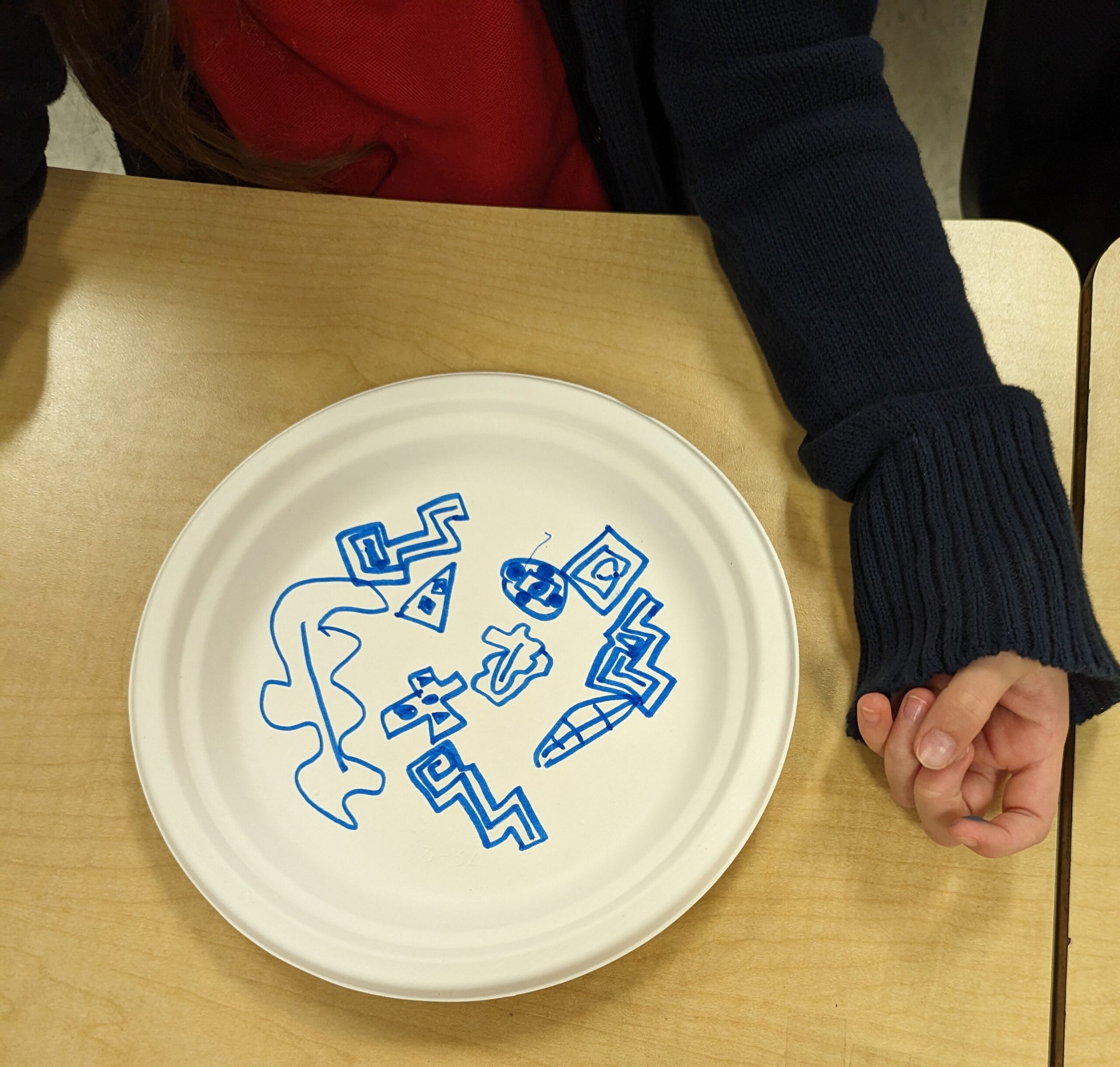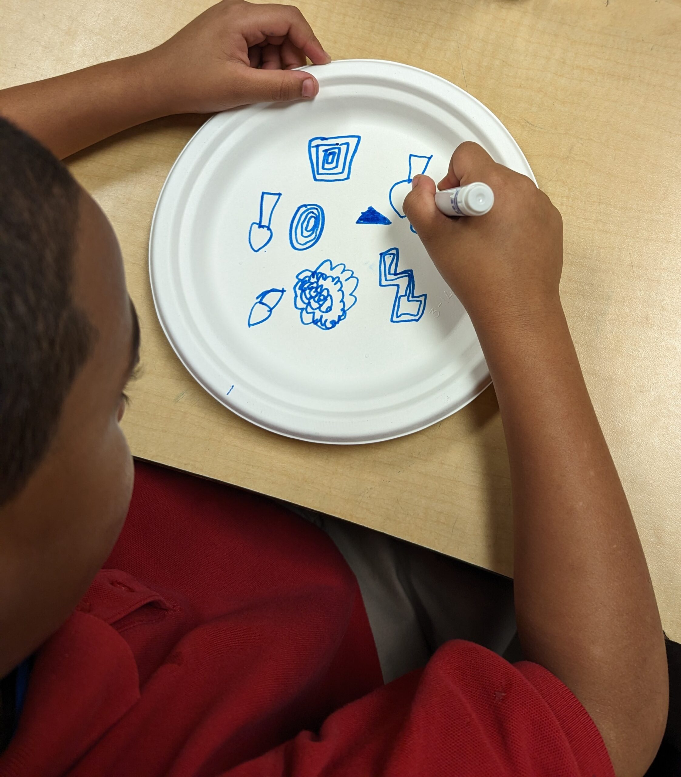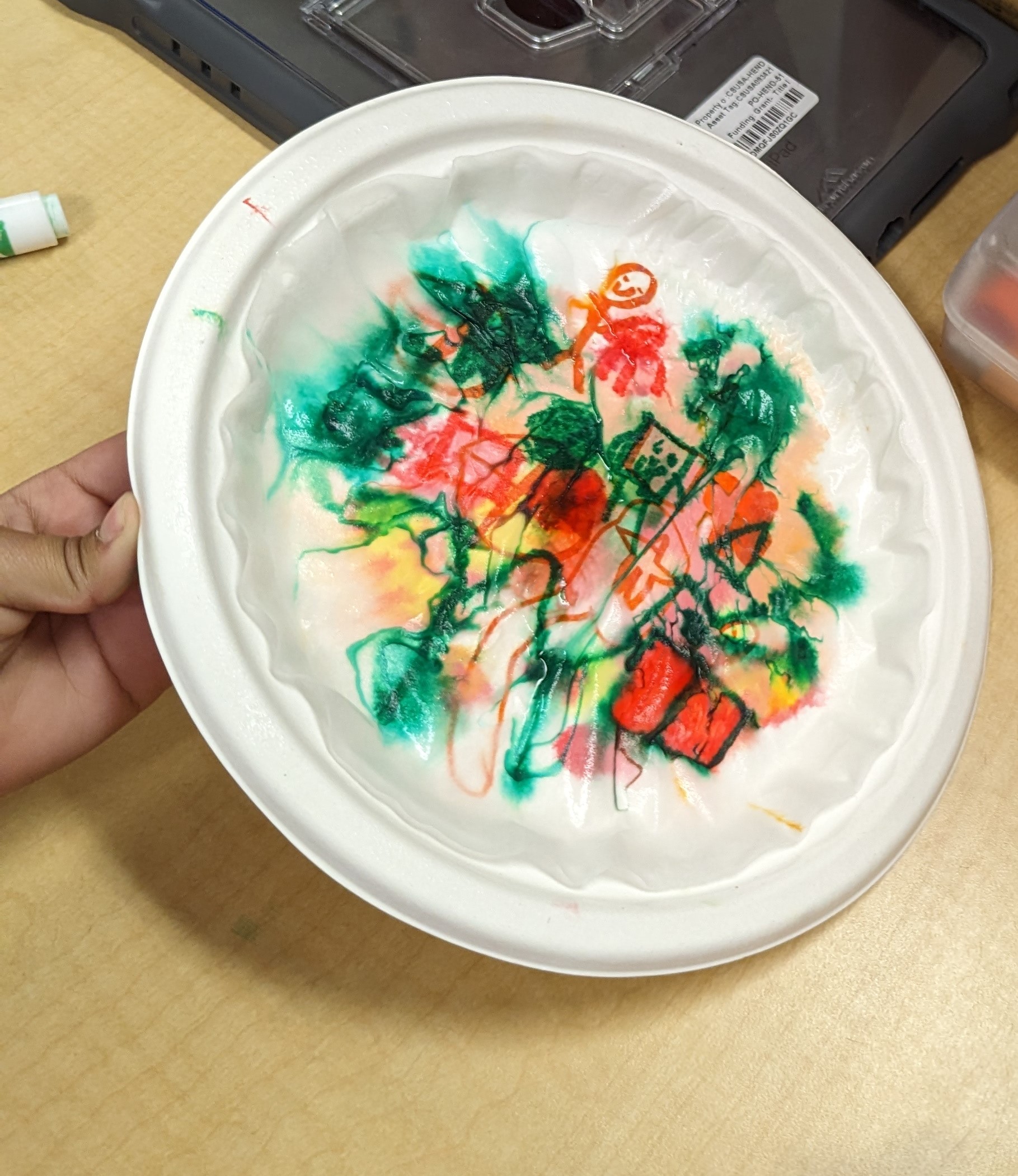 Students began by laying down a primary color on a paper plate using a Crayola Marker, drawing shapes and patterns of their choosing. This was followed by the application of a second Primary color to create their chosen Secondary color.