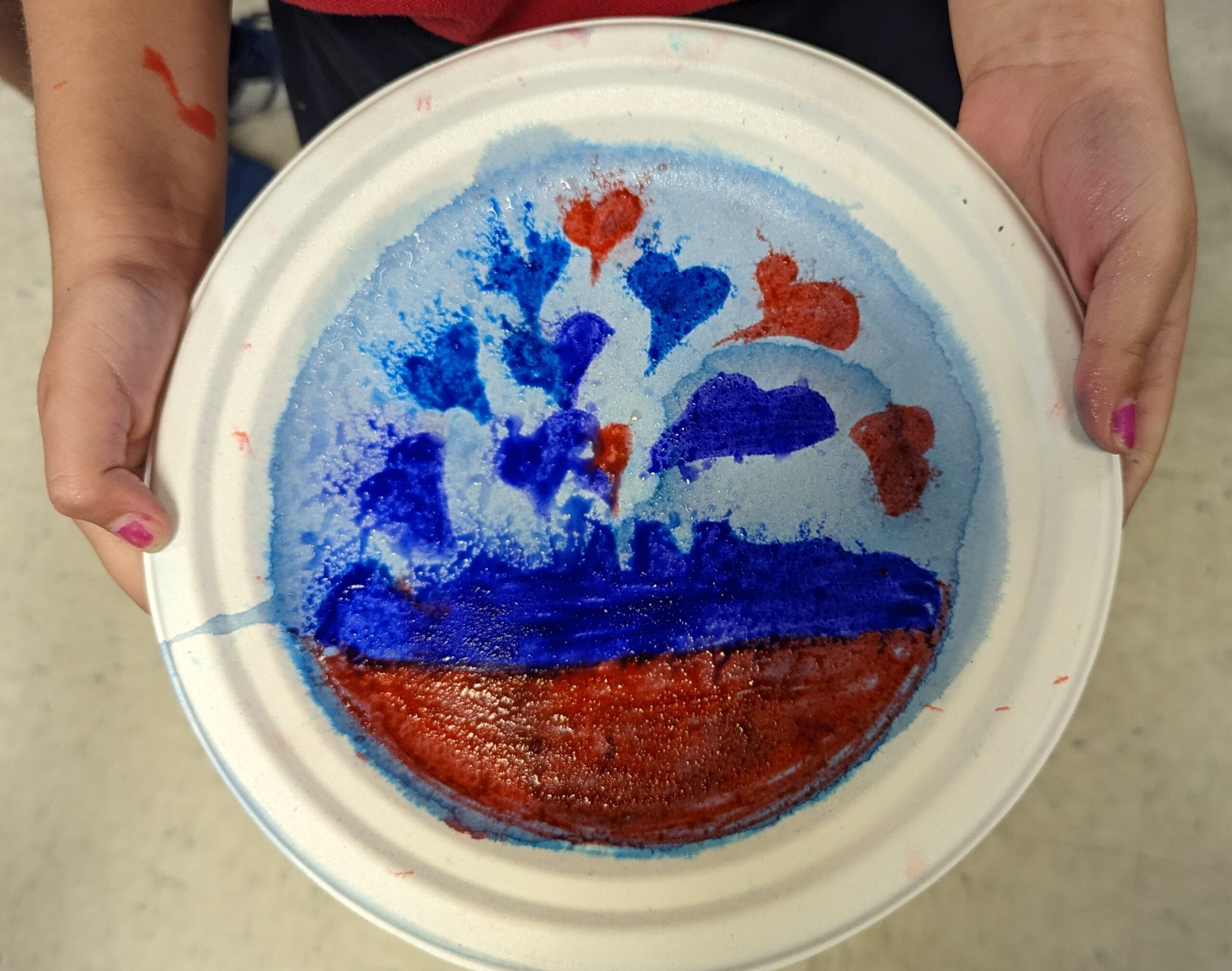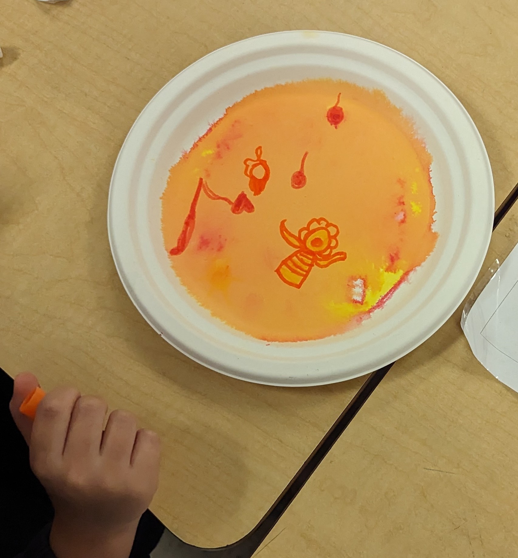 Once both colors were drawn on the plate, students sprayed their plates with a water bottle to facilitate the mixing of the colors. To the students wonder they witnessed how their color creations mixed to create new colors.